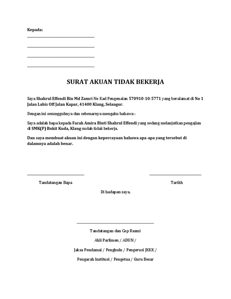 Contoh Surat Rasmi Akuan Tidak Bekerja