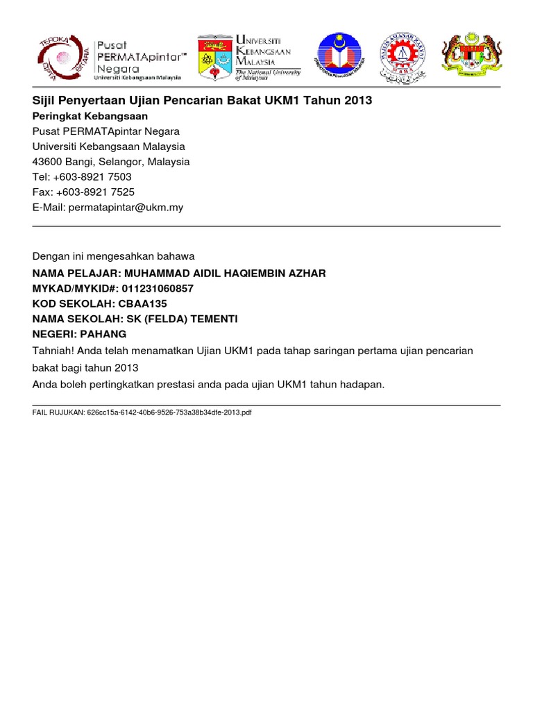 . 2017 Ujian dalam talian ini adalah percuma dan boleh. Ujian dalam talian UKM1 merupakan saringan pertama untuk mencari pelajar-pelajar pintar cerdas berusia 8 hingga 15 tahun bagi menyertai Program PERMATApintar Negara. - Murid berusia 9 15 tahun untuk program PERMATA Pintar Universiti Kebangsaan Malaysia.